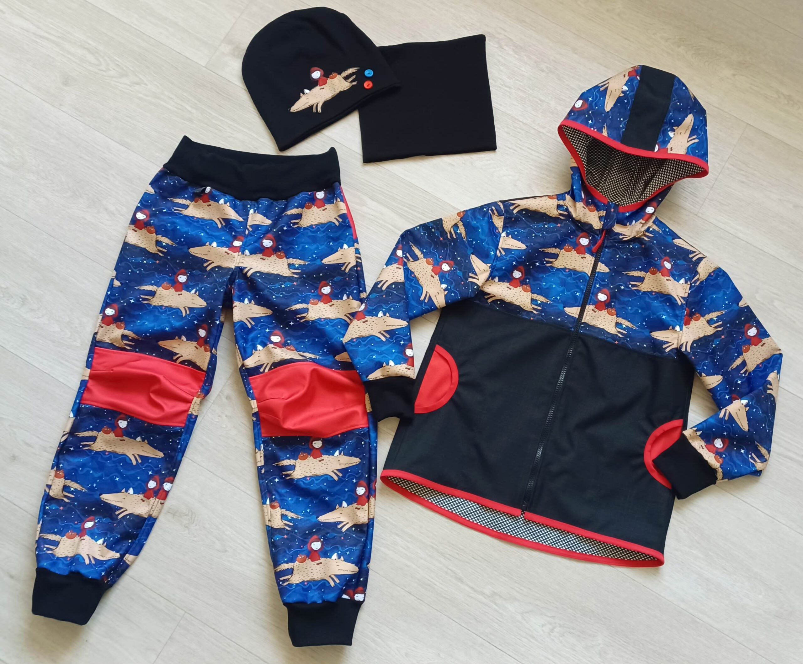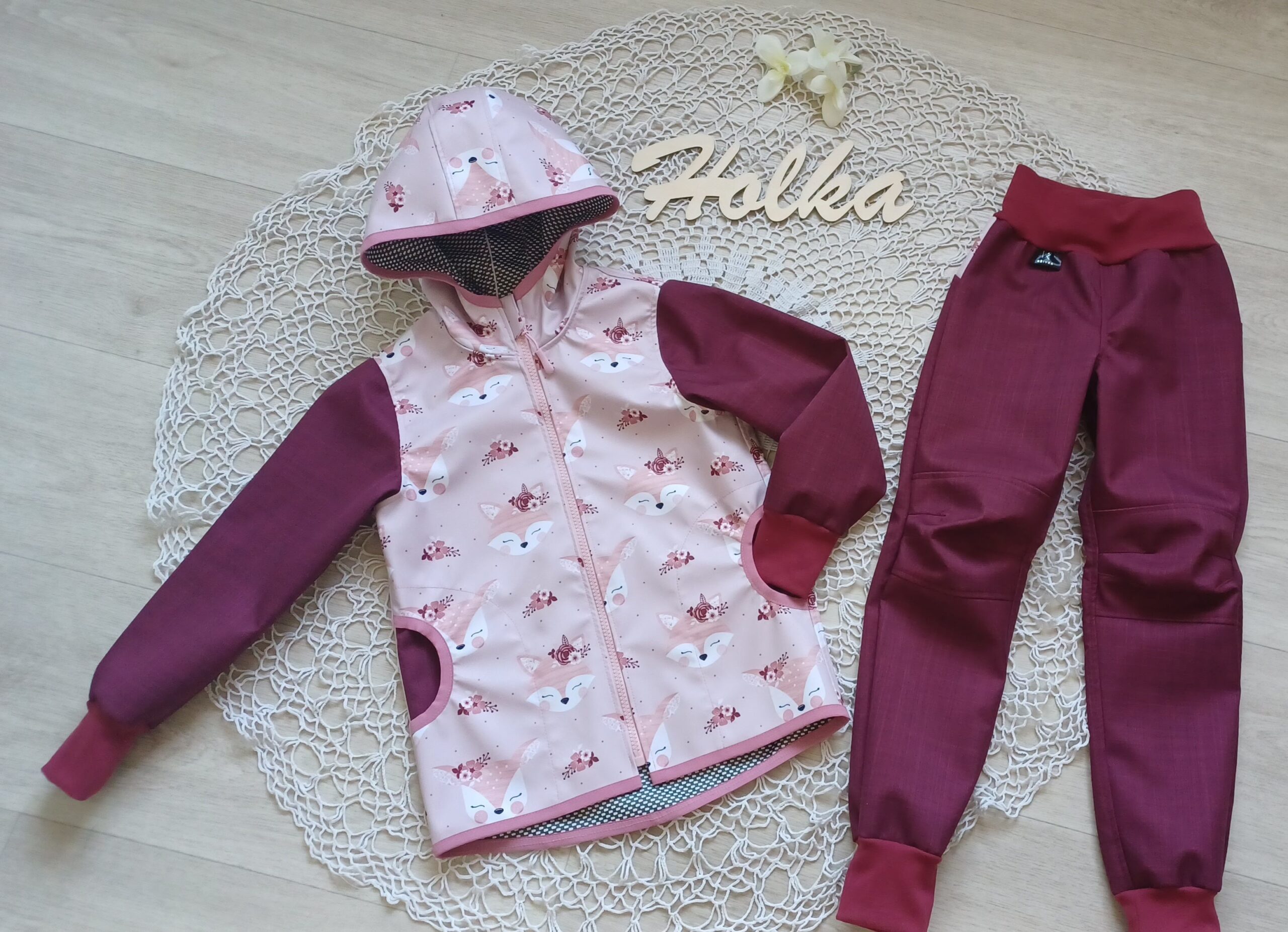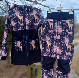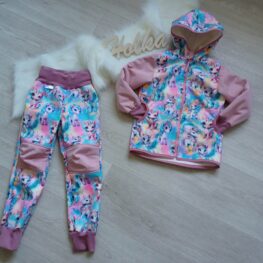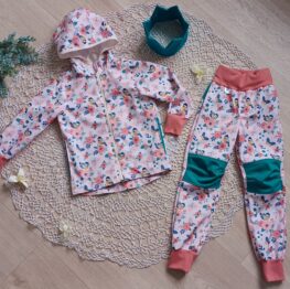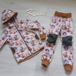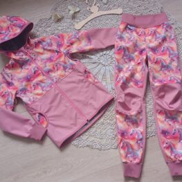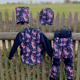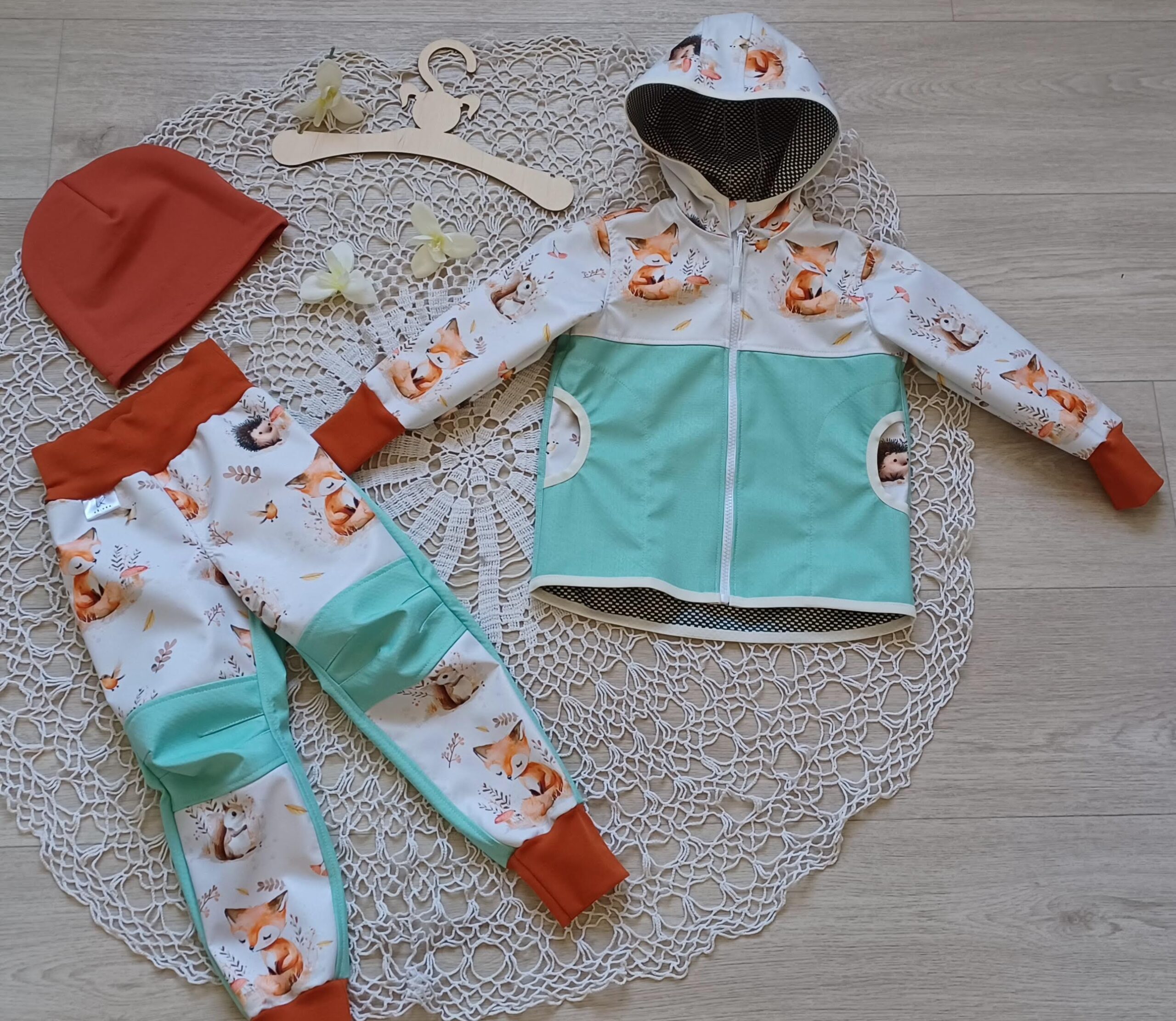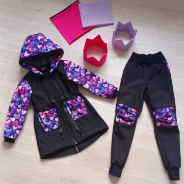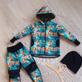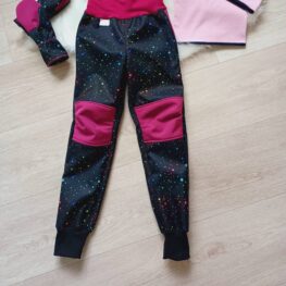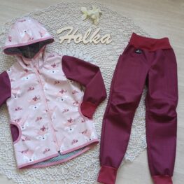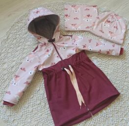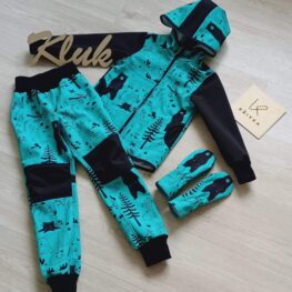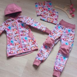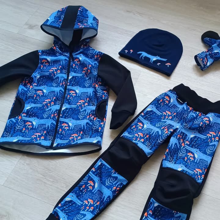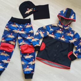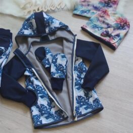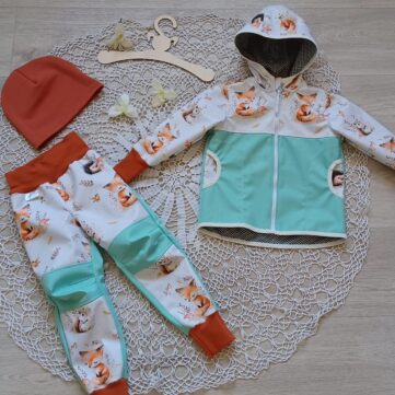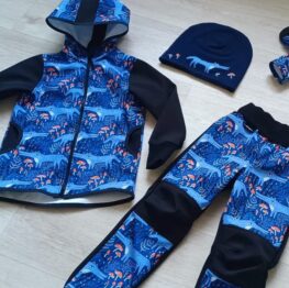 Tvoří je rostoucí softshellová bunda/kabátek a rostoucí softshellové kalhoty případně i rukavice. Pro Ty z Vás, co máte opravdu rádi vyladěné setíky, nabízím i možnost ušití čepice či nákrčníku ve stejném designu.