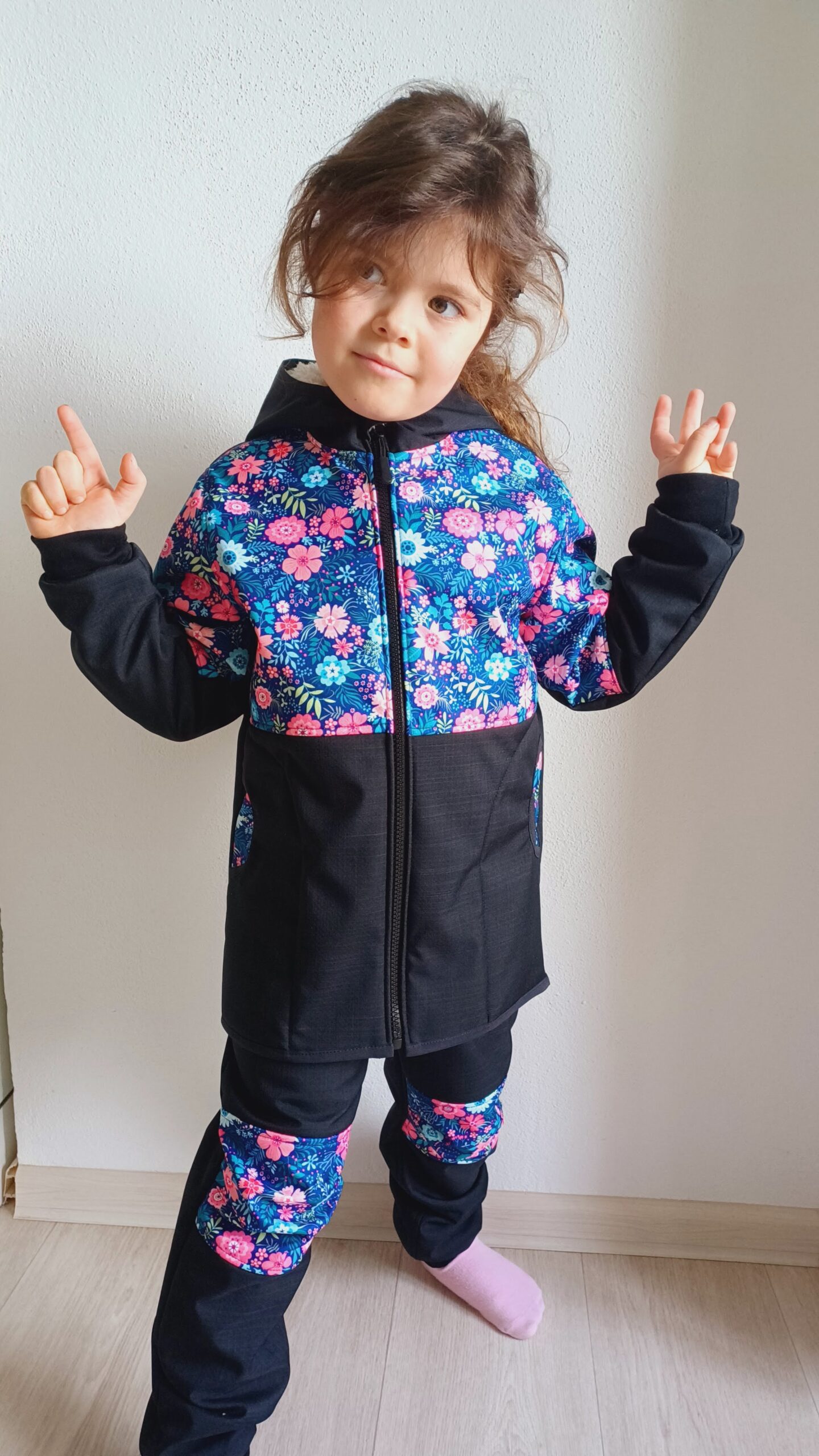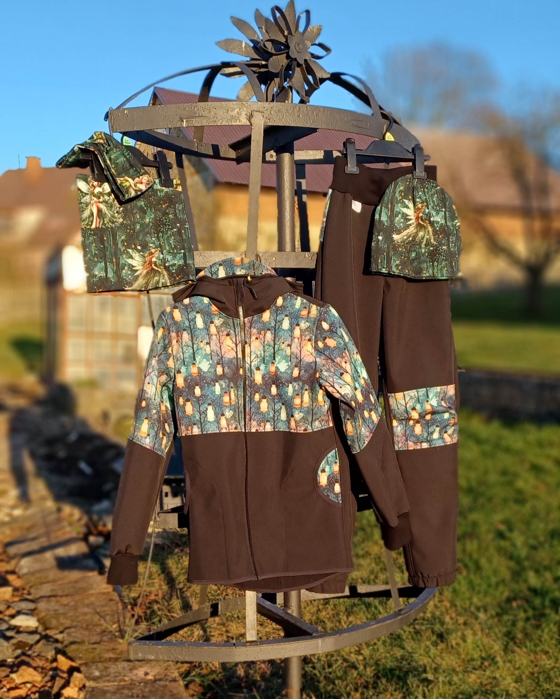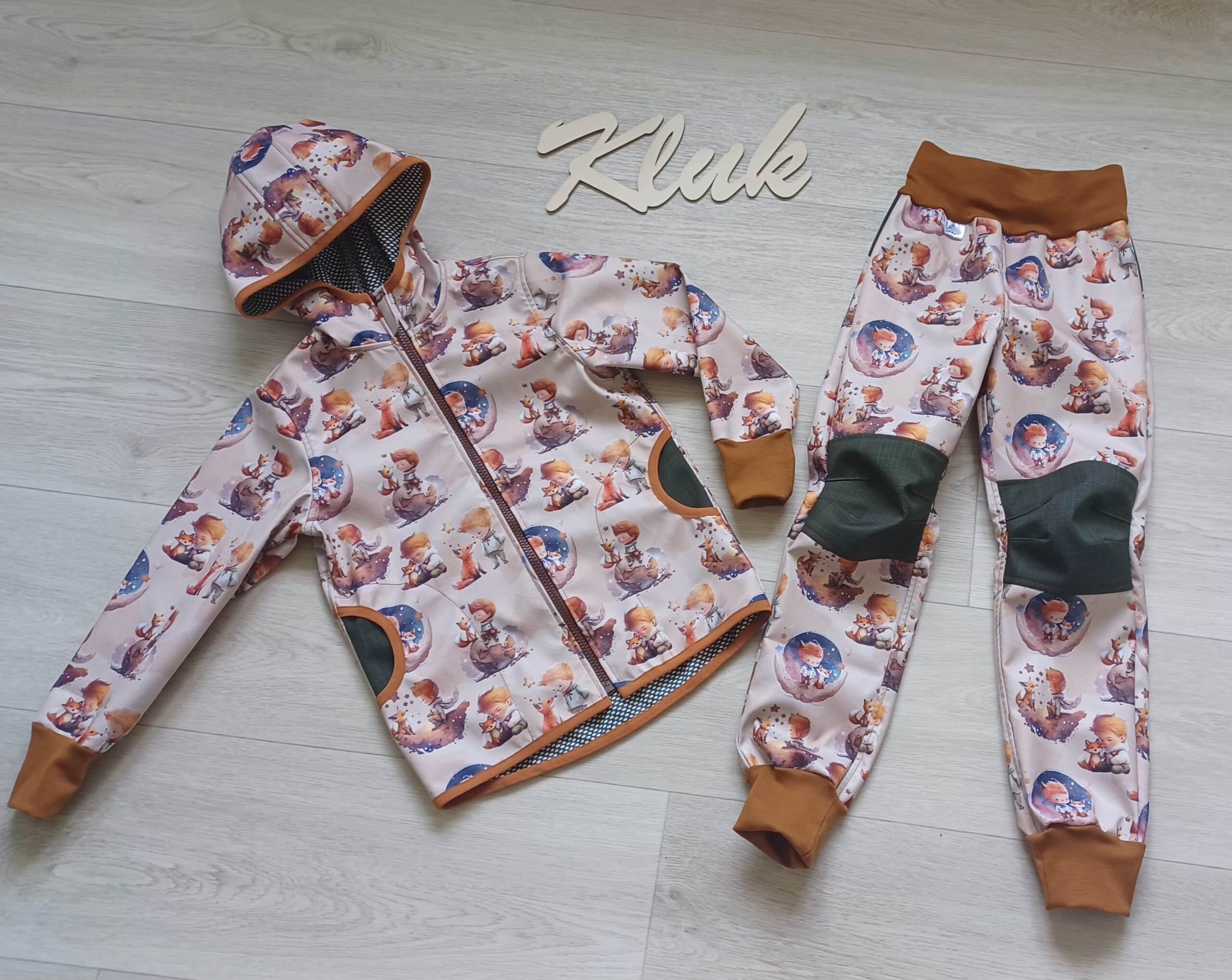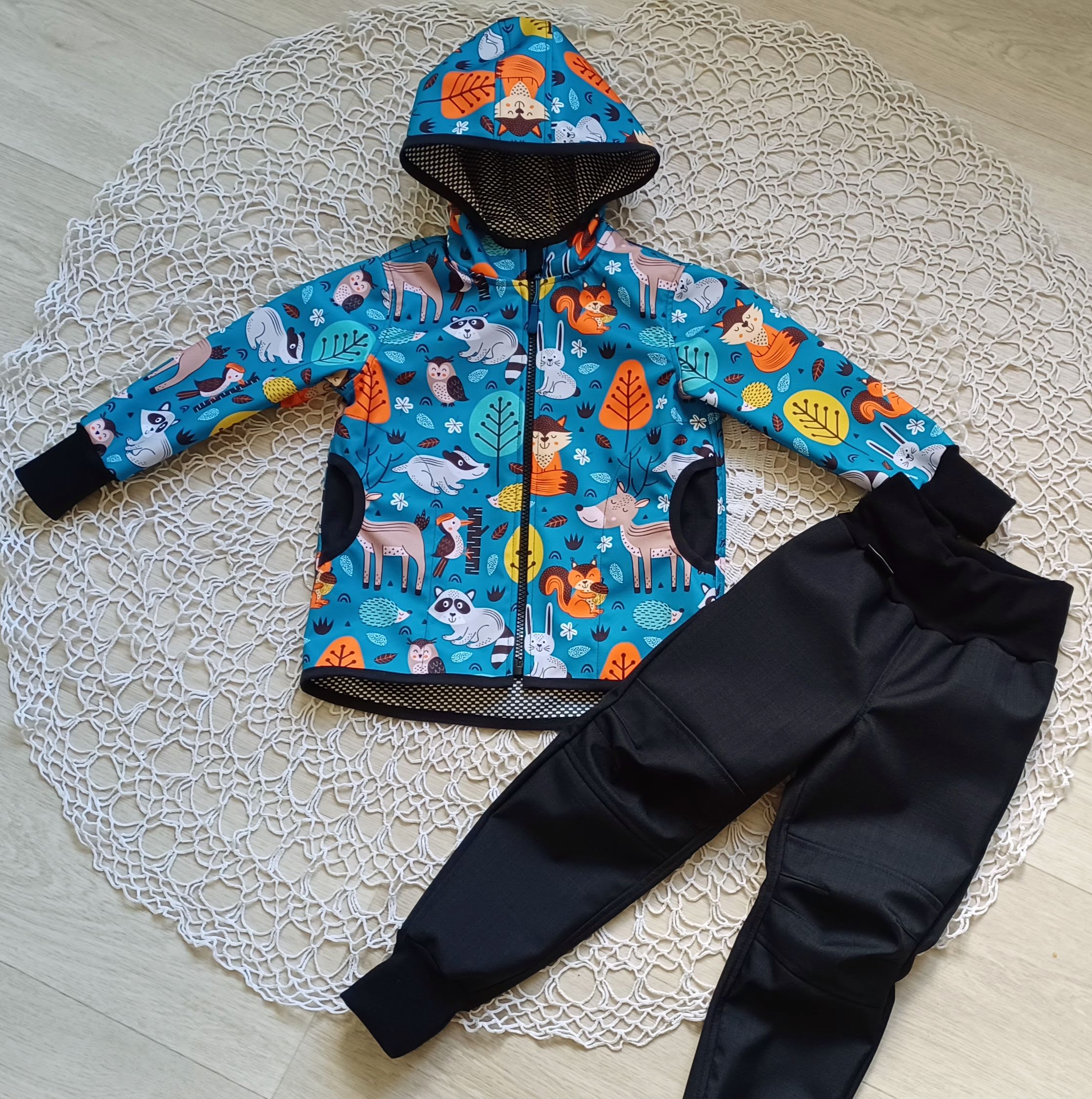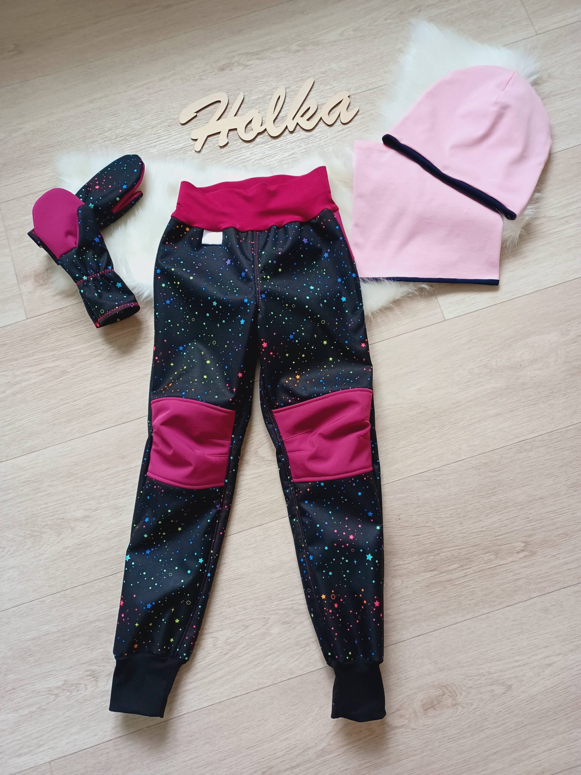 Tvoří je rostoucí softshellová bunda/kabátek a rostoucí softshellové kalhoty případně i rukavice. Pro Ty z Vás, co máte opravdu rádi vyladěné setíky, nabízím i možnost ušití čepice či nákrčníku ve stejném designu.