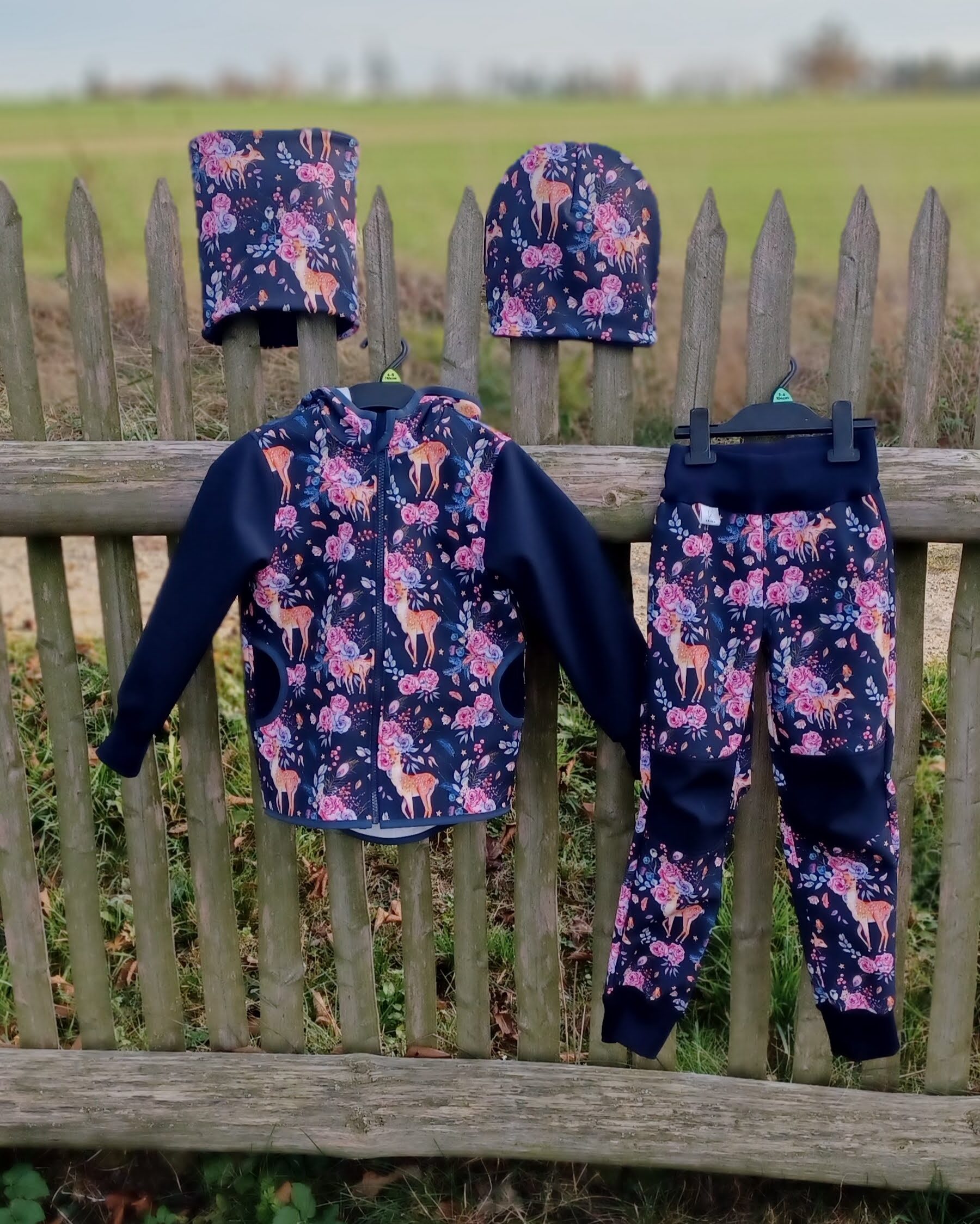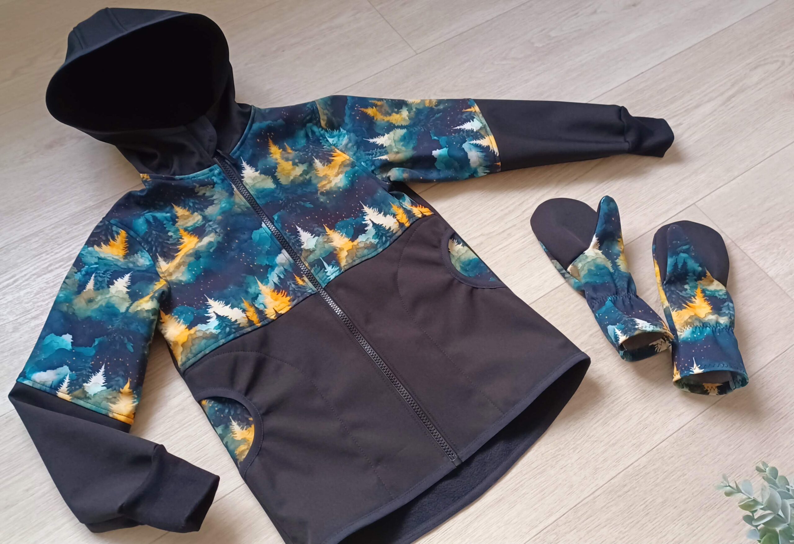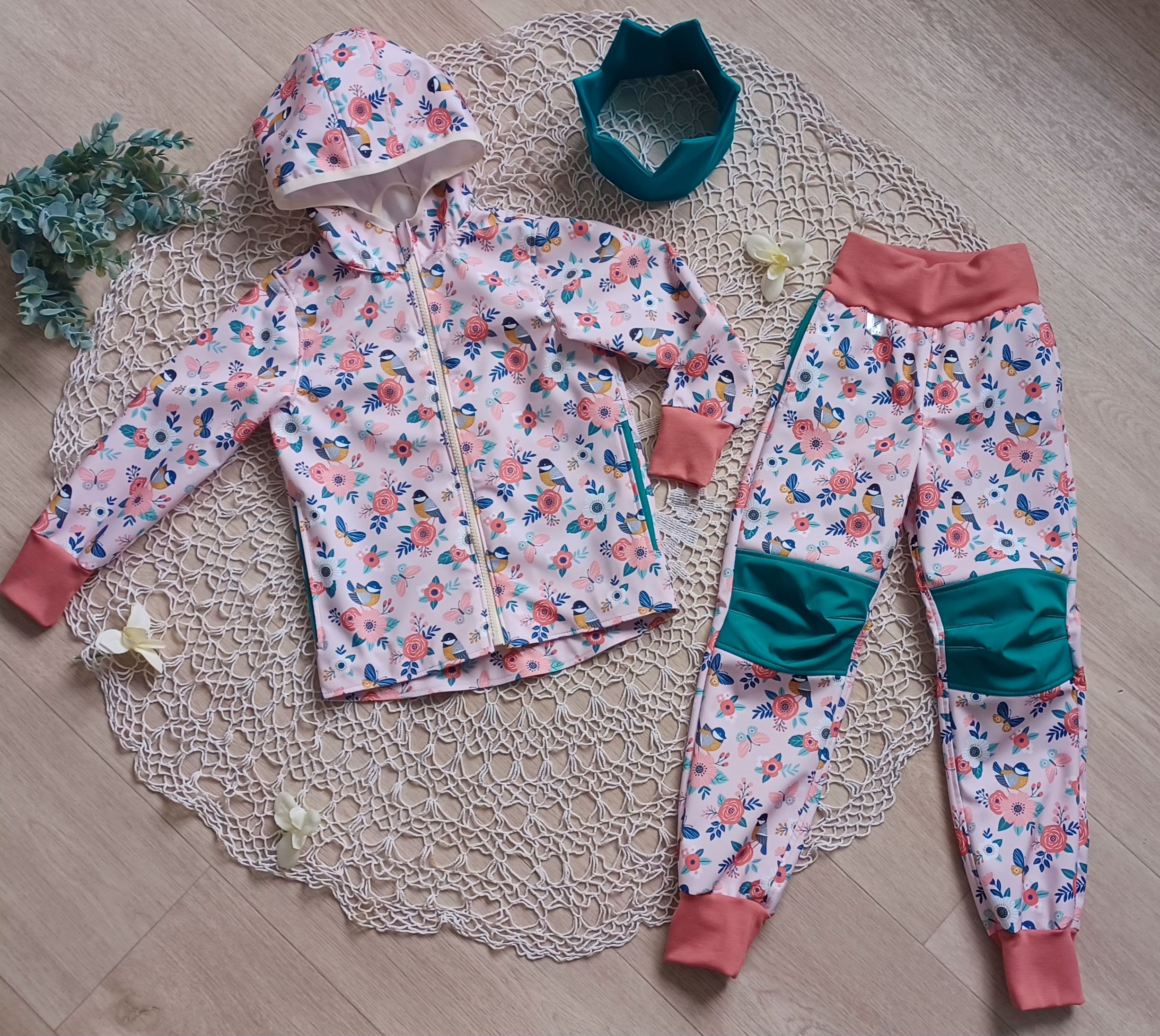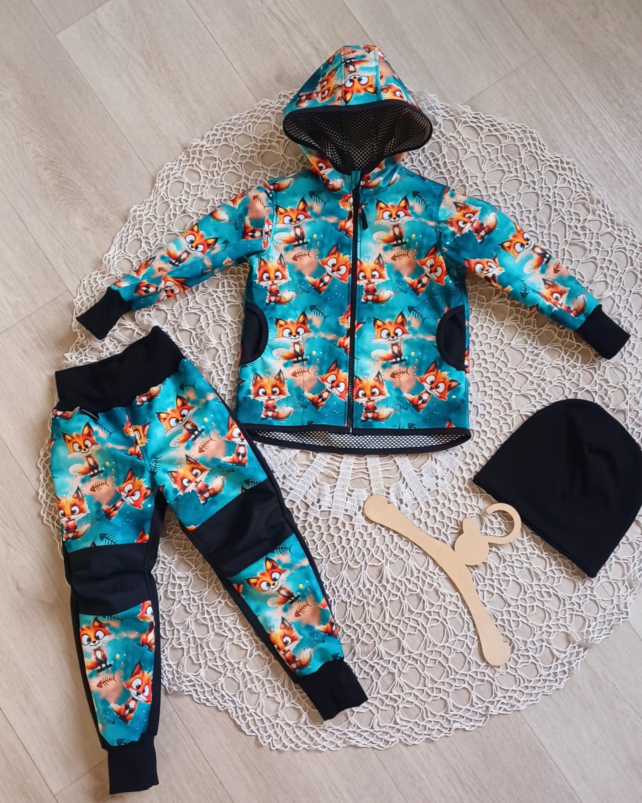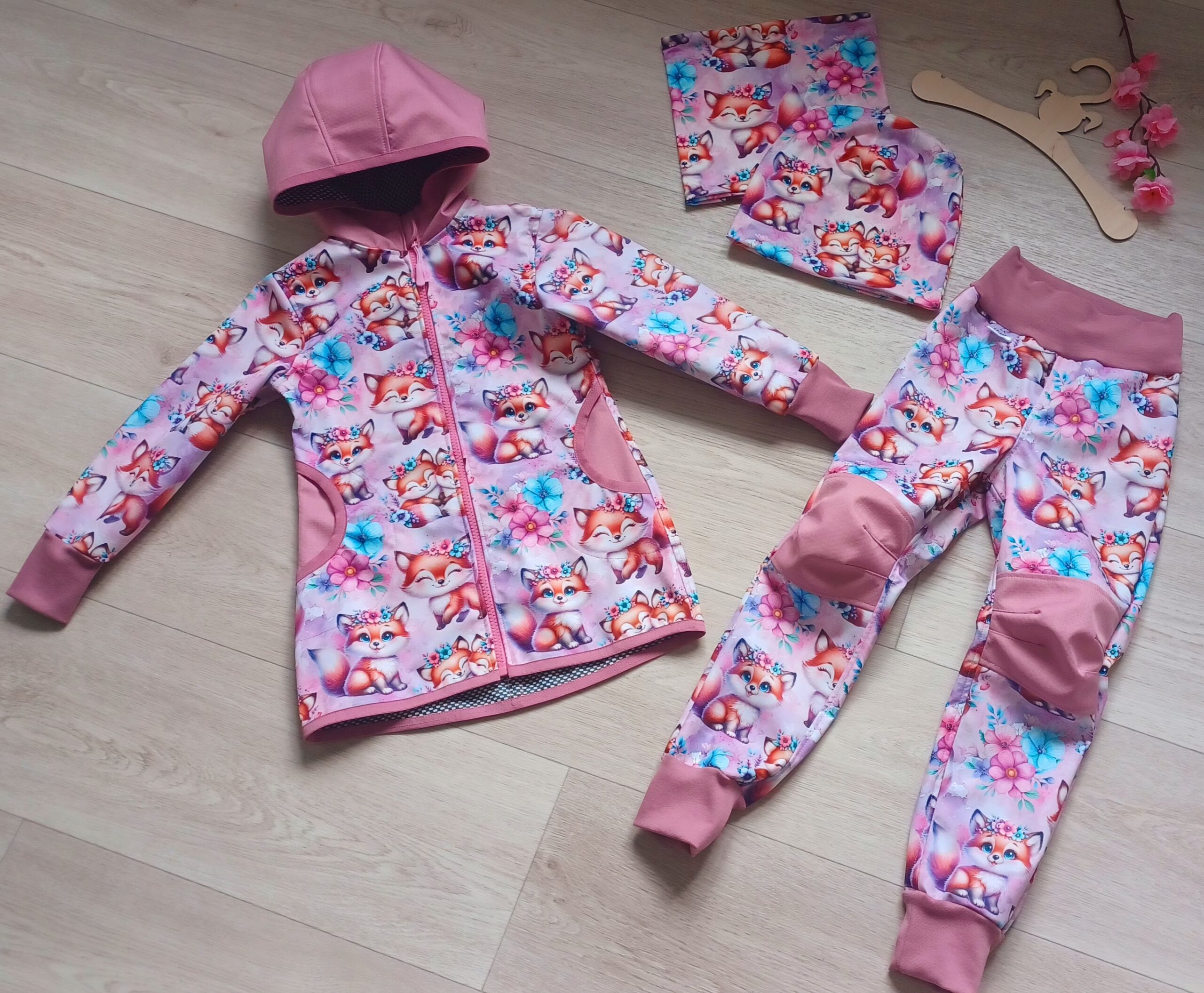Tvoří je rostoucí softshellová bunda/kabátek a rostoucí softshellové kalhoty případně i rukavice. Pro Ty z Vás, co máte opravdu rádi vyladěné setíky, nabízím i možnost ušití čepice či nákrčníku ve stejném designu.
