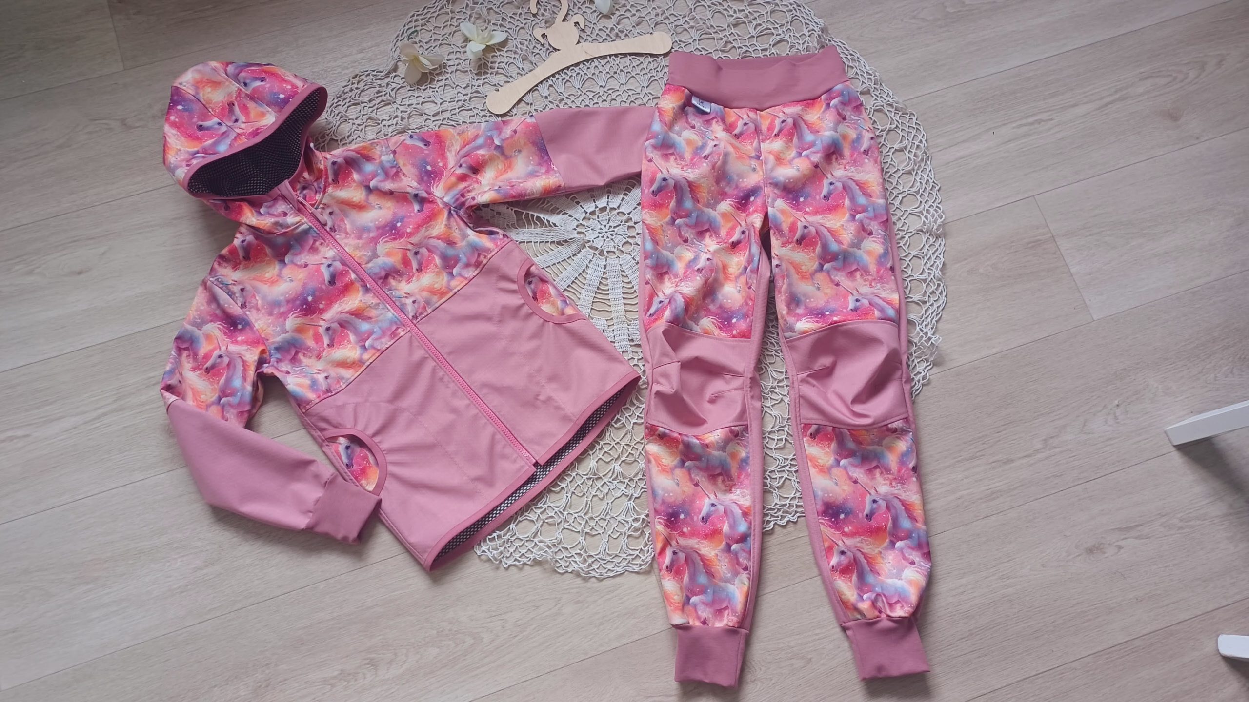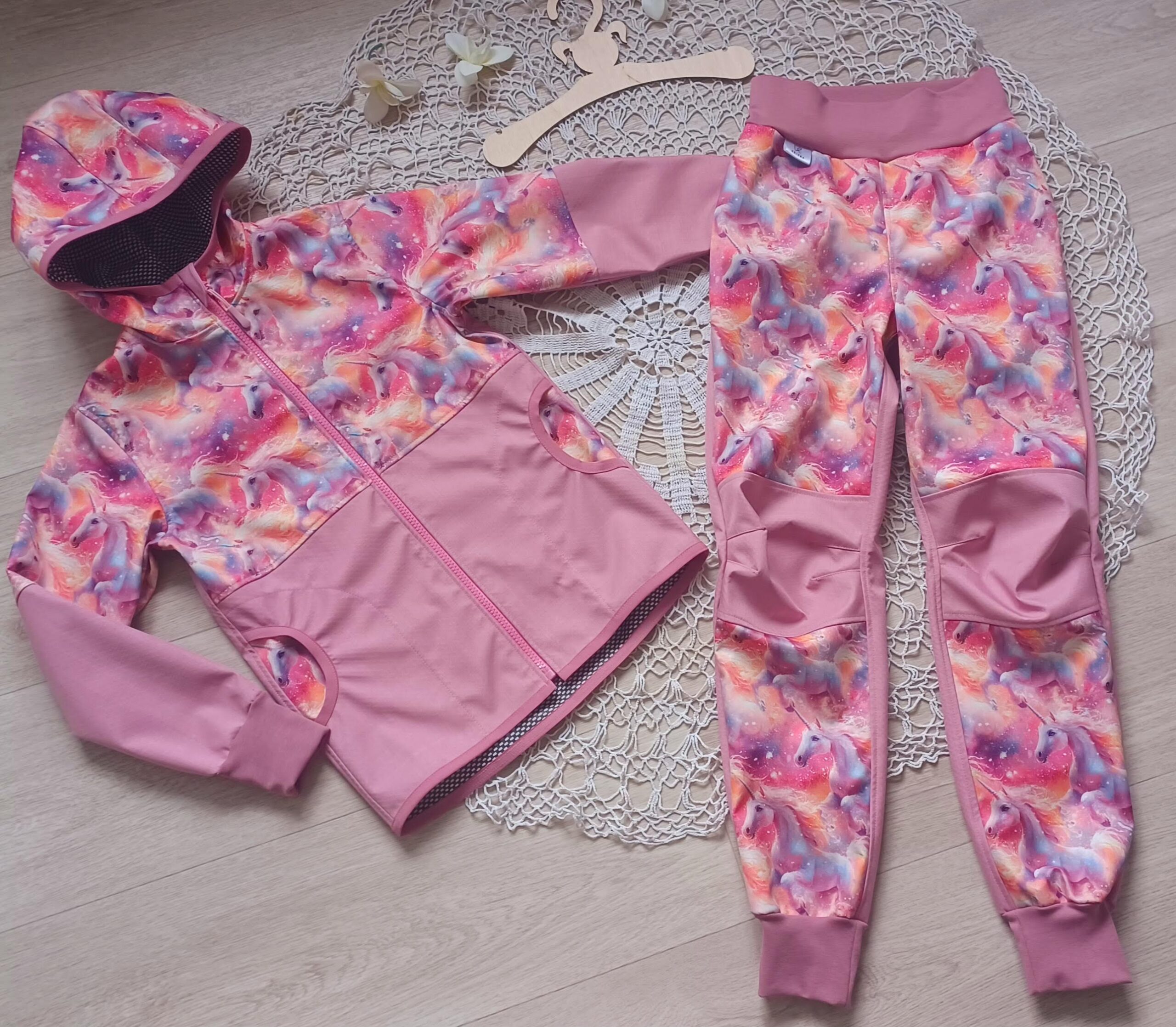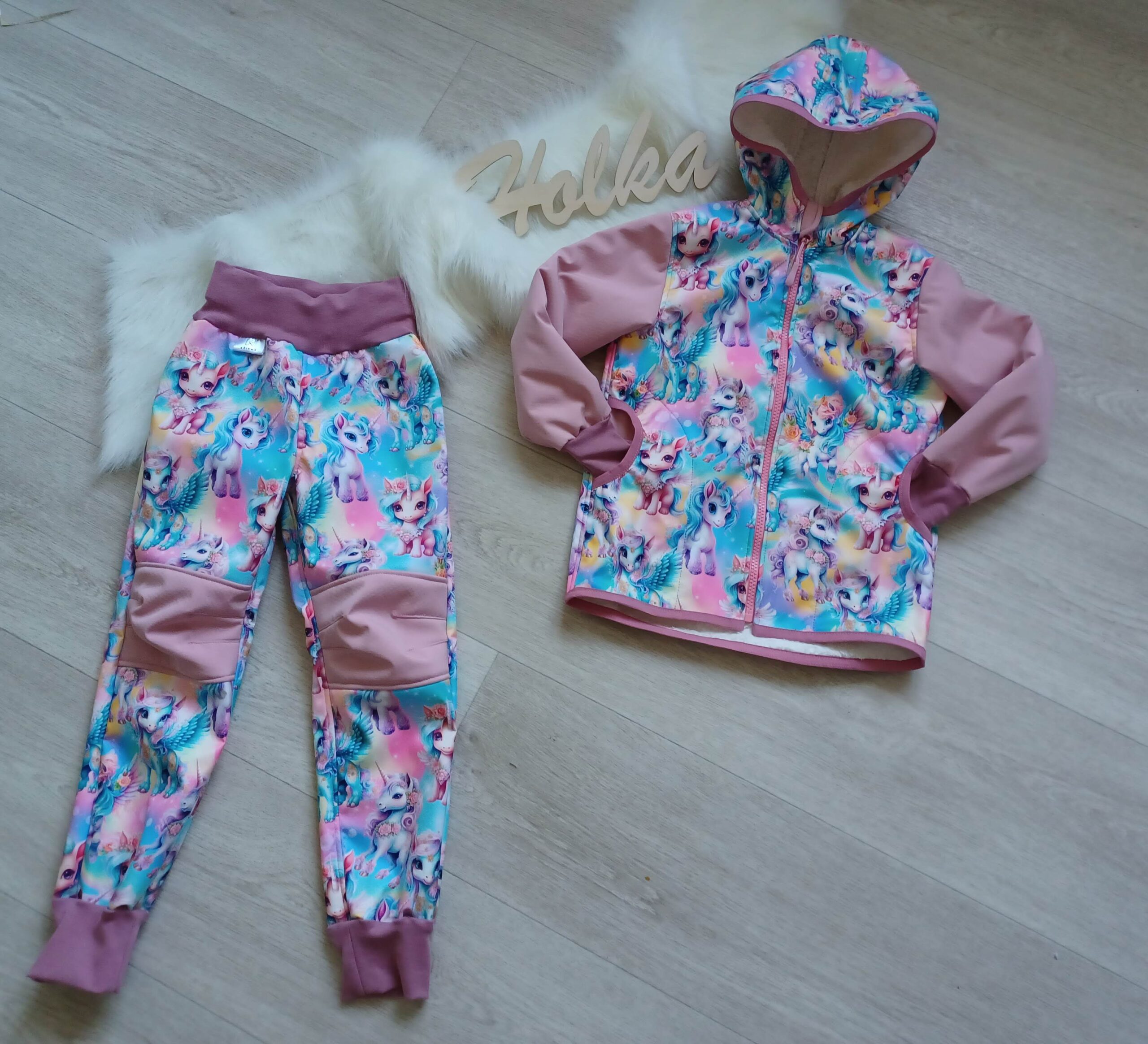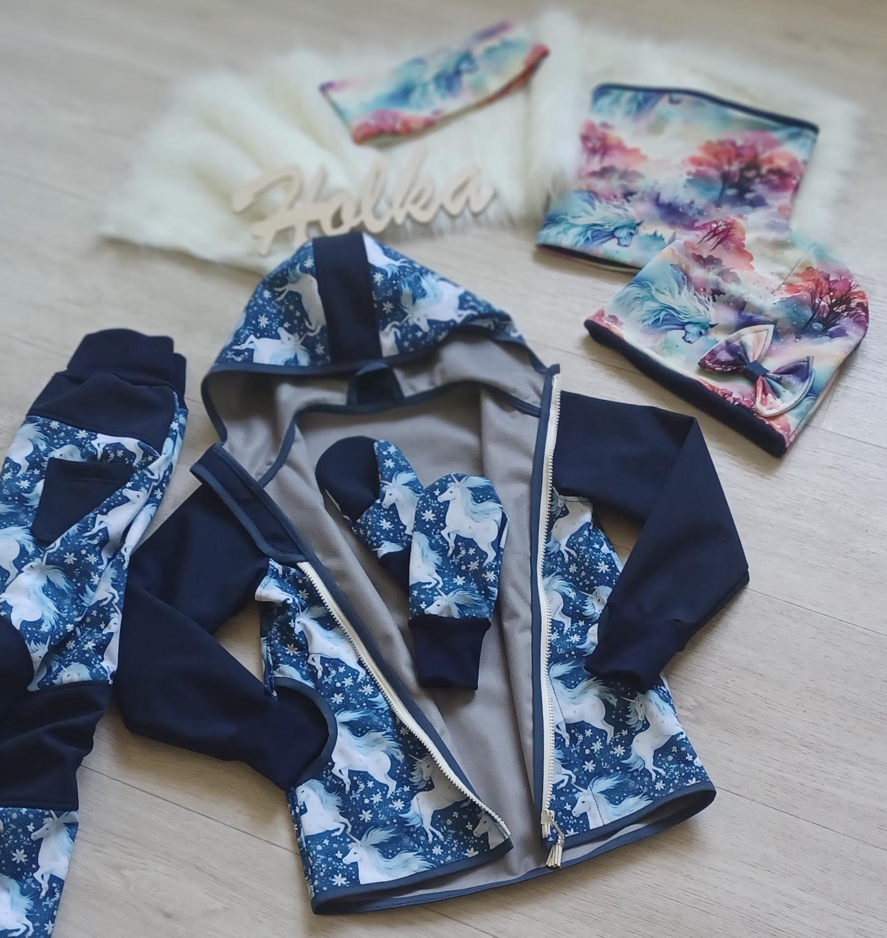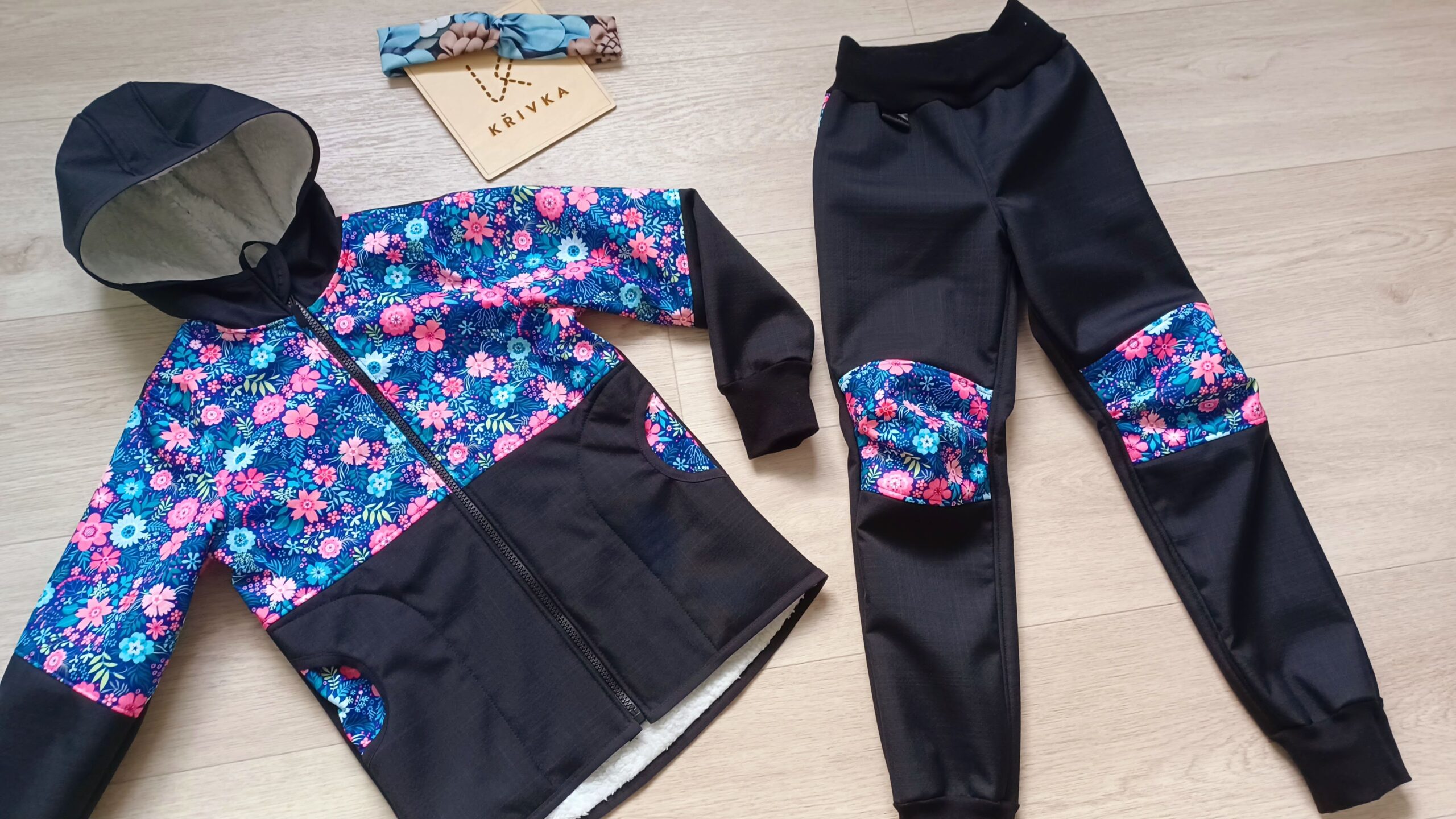 Tvoří je rostoucí softshellová bunda/kabátek a rostoucí softshellové kalhoty případně i rukavice. Pro Ty z Vás, co máte opravdu rádi vyladěné setíky, nabízím i možnost ušití čepice či nákrčníku ve stejném designu.