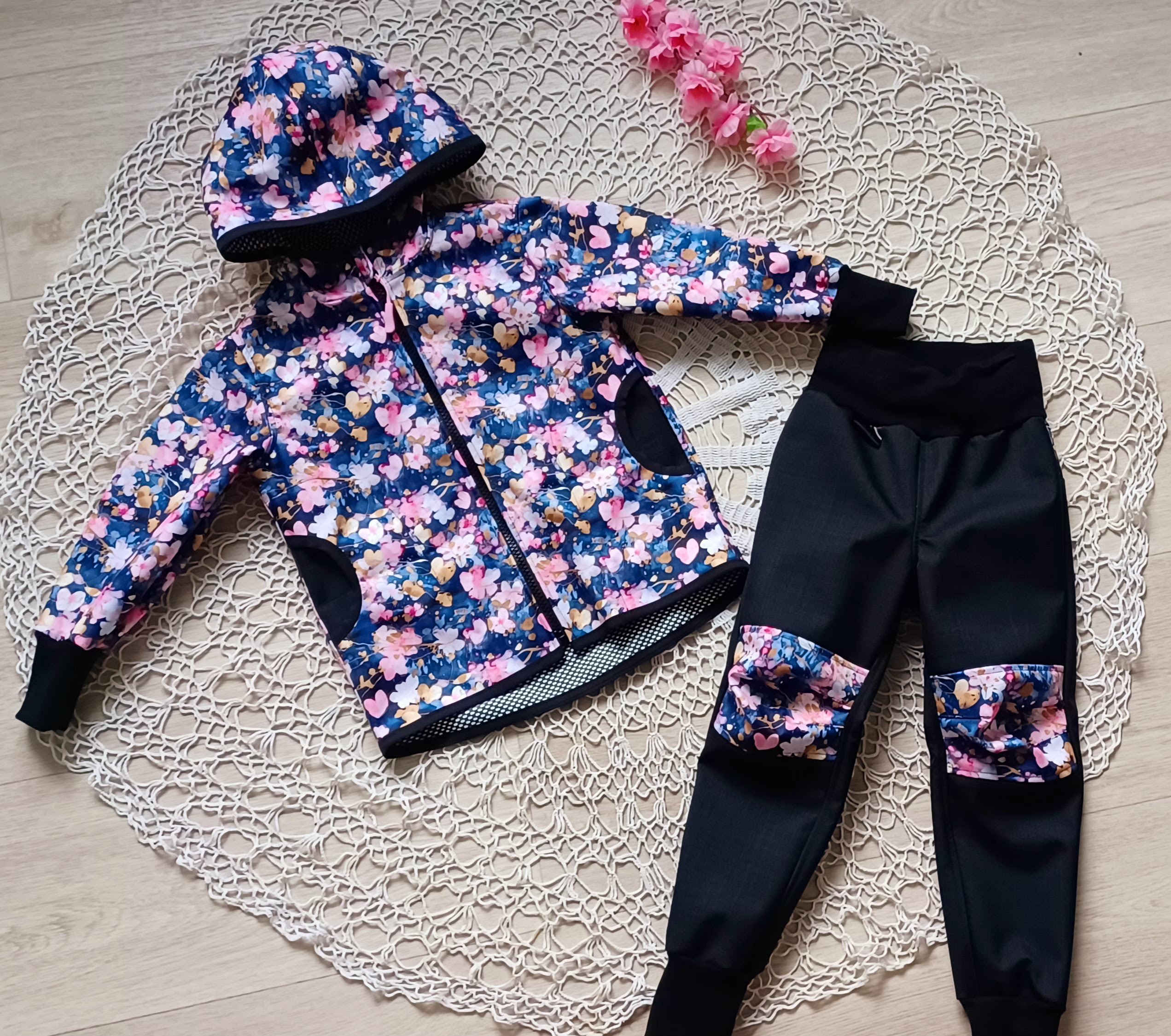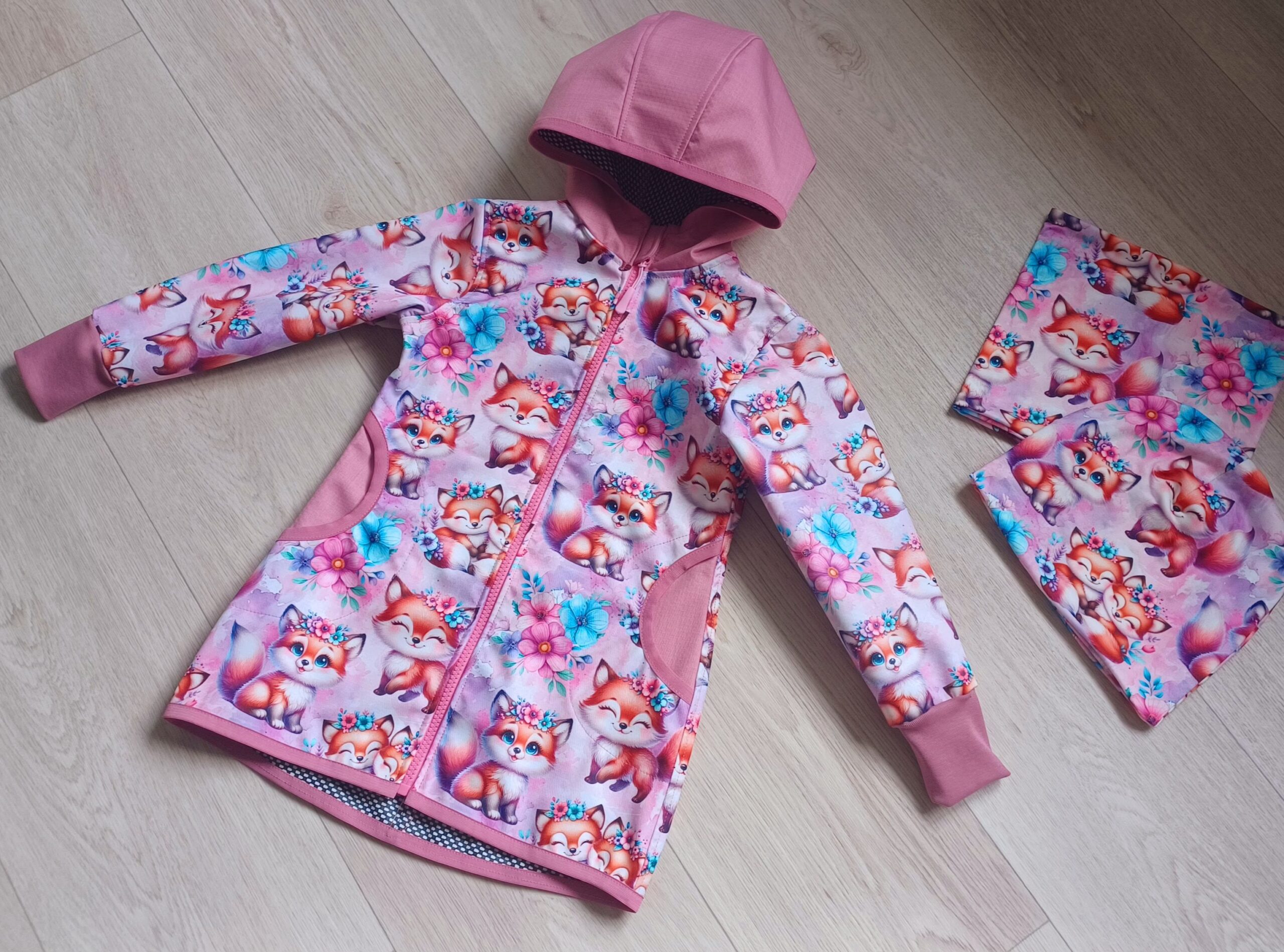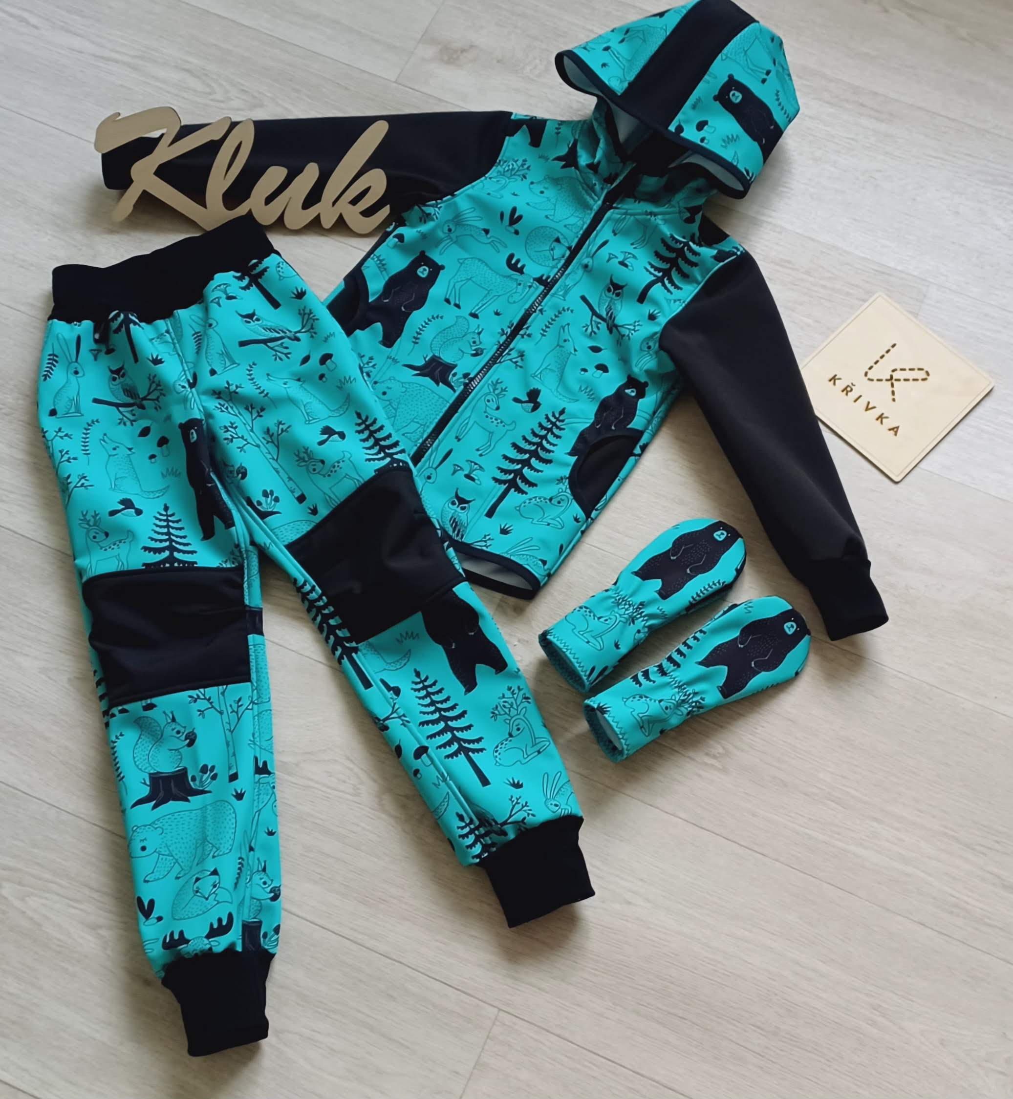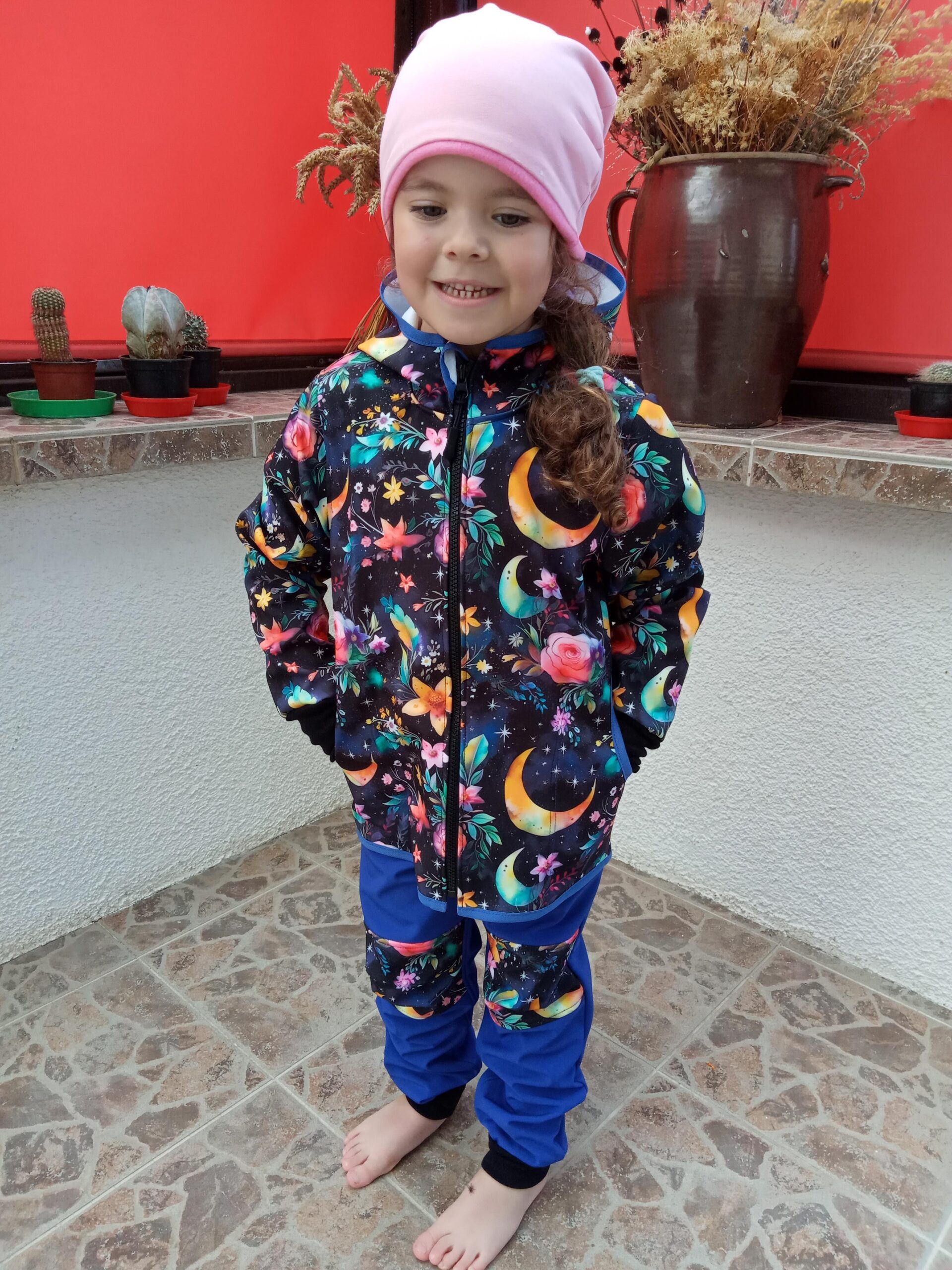 Tvoří je rostoucí softshellová bunda/kabátek a rostoucí softshellové kalhoty případně i rukavice. Pro Ty z Vás, co máte opravdu rádi vyladěné setíky, nabízím i možnost ušití čepice či nákrčníku ve stejném designu.